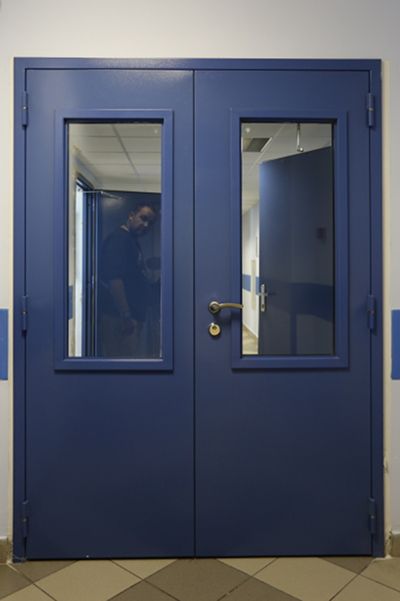 Противопожарная алюминиевая дверь синего цвета в Люберцах