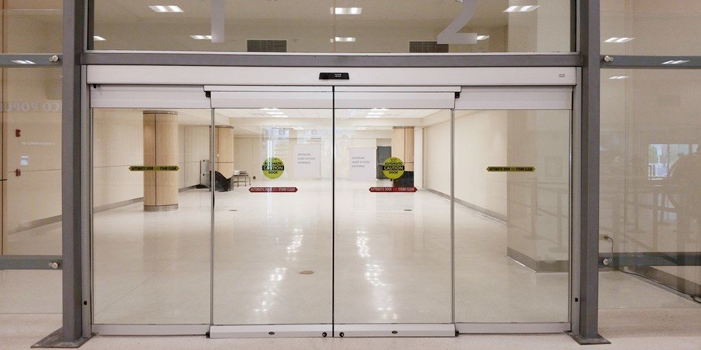 Противопожарная безрамная дверь со стеклом в бизнес центр в Люберцах