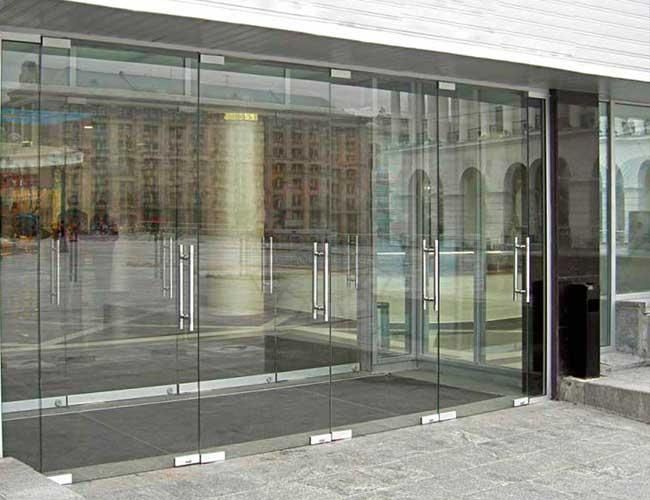 Противопожарная безрамная дверь со стеклом в торговый центр в Люберцах